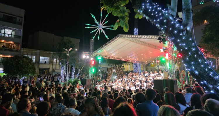 A Praça Cesário Alvim, no Centro da cidade, sediou uma Cantata de Natal que marcou a inauguração da decoração que ilumina a terra do Pai da Aviação, na Zona da Mata mineira
